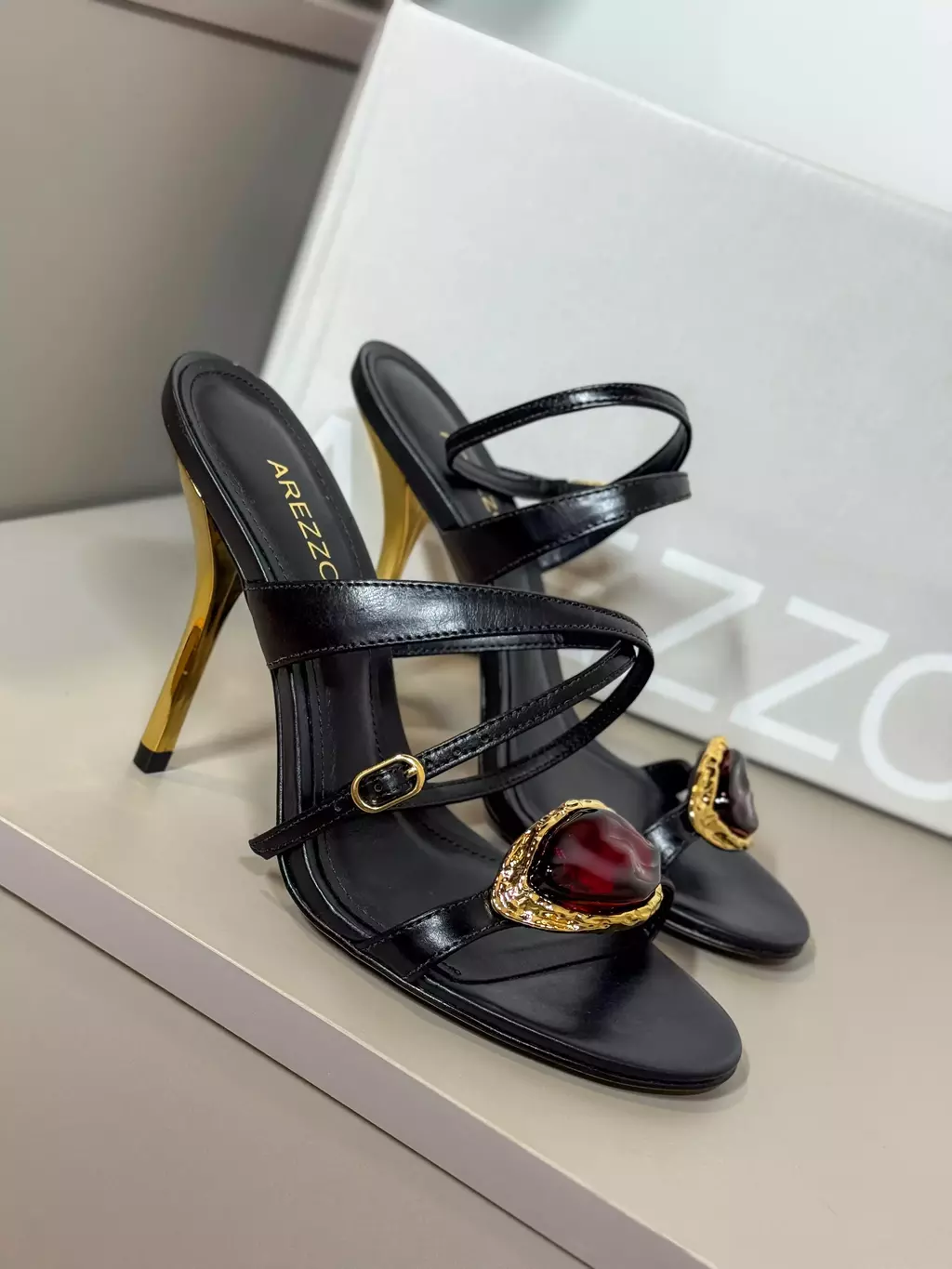 A sandália possui um design minimalista, vem com pedraria imponente e acabamento em couro macio, expressando as tendências da temporada. Cria looks elegantes e insere sofisticação nas produções.
